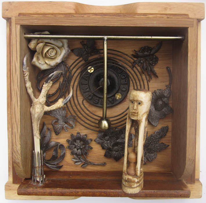 bone carving, clock chime, metal and ceramic flowers