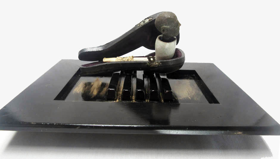 moulded wax head in a clay pipe with a cigarette holder