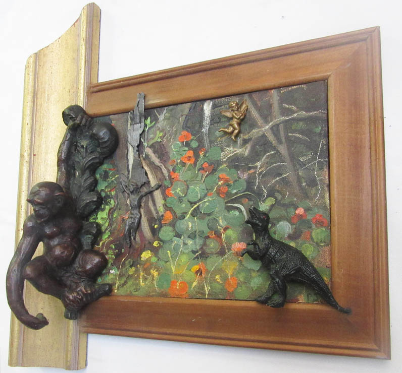 a dinosaur, and an ape climbing out of the jungle.