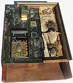 a clear glass block rising from the circuitry