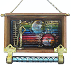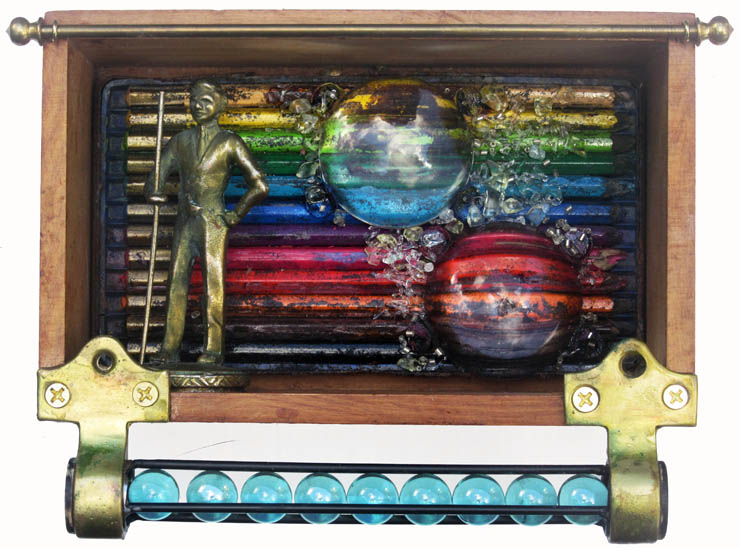 blue marbles, brass fittings, magnifying lenses and glass fragments