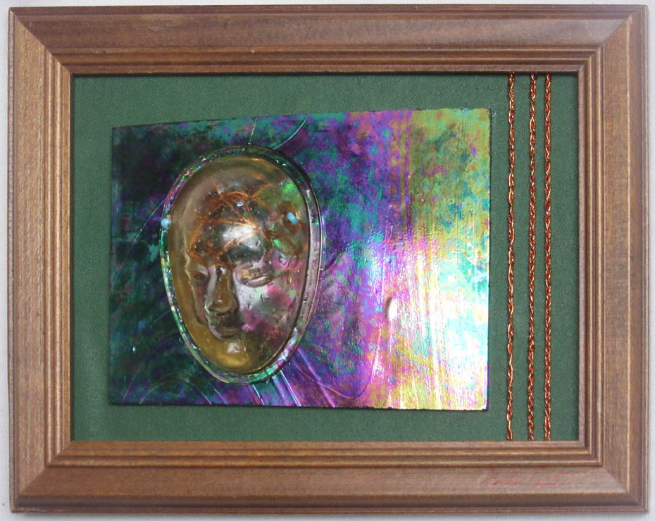 A hollow cast face, on a sheet of wildly-coloured glass