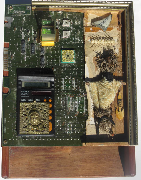 found materials: old circuit board, light-operated calculator, old brass religious object