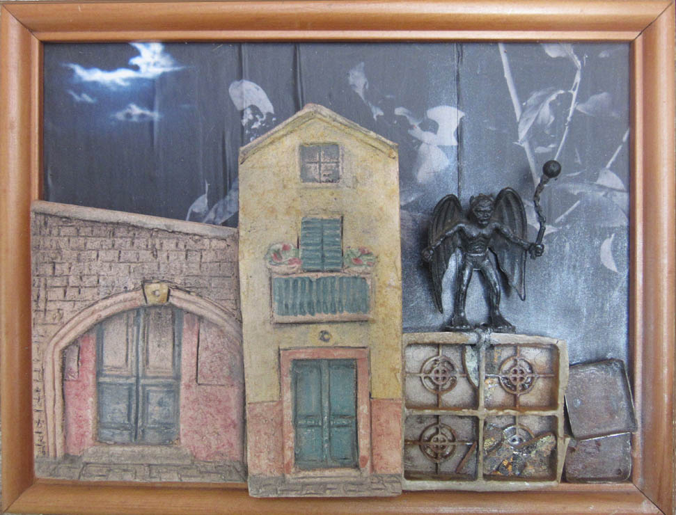 Italian fired clay houses, assorted ruins, and a demonic figure.